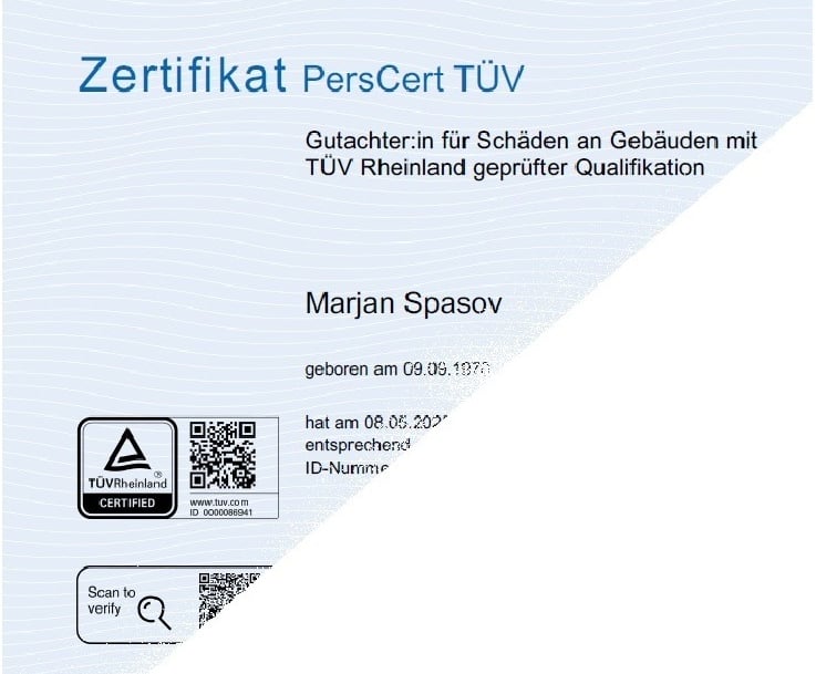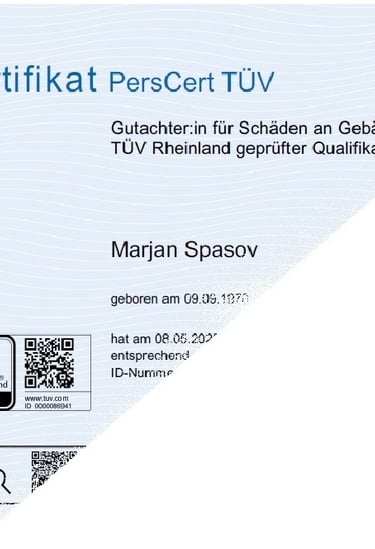 Hr. Spasov ist TÜV Rheinland geprüfter Gutachter für Schäden an Gebäuden und staatlich geprüfter Techniker der Maschinentechnik.