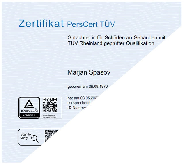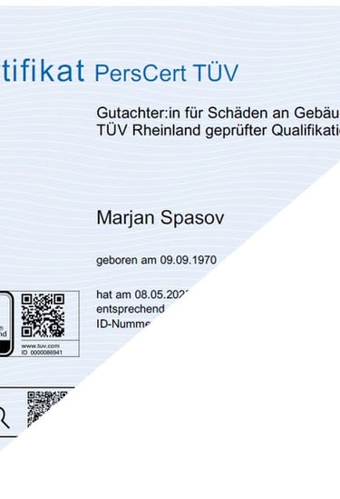 Inhaber Marjan Spasov ist TÜV Rheinland geprüfter Gutachter für Schäden an Gebäuden (Zert.-Nr. 4032291) und staatlich geprüfter Techniker der Maschinentechnik. Auf dieser Grundlage erstellen wir sachliche, nachvollziehbare und DIN-konforme Gutachten, die als verlässliche Entscheidungsgrundlage für Sanierungen, Versicherungsfälle, Kaufentscheidungen oder rechtliche Fragestellungen dienen.